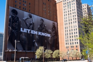 体育资讯4月18日讯 今日,ESPN克利夫兰分台官推晒出一张照片,展现骑士主场附近建筑上为迎接季后赛而悬挂的全新巨幅海报。