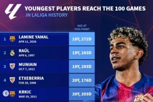 体育资讯4月12日讯 巴萨在本轮西甲4-1击败西班牙人。亚马尔独造三球,也成为历史最年轻的西甲百场先生。